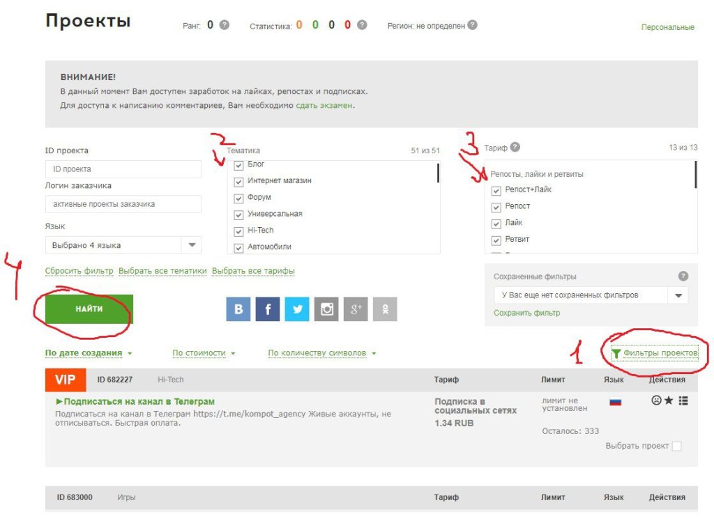 Далее в фильтре проектов клацаем везде галочки и нажимаем найти. Это нужно для того чтобы отображалось наибольшее число заданий.