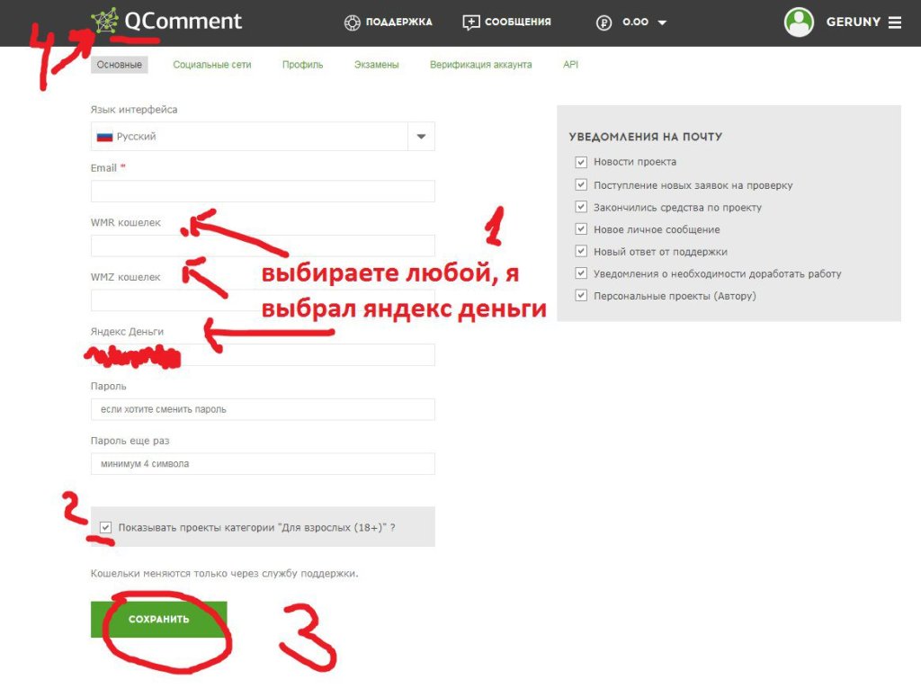 Нажимаем на настройки и вводим свой электронный кошелёк. Вводим долларовый вебмани (WMZ), задания с отзывами будут приходить по 0.37$ именно в долларах, вывод минимальный от 1$, всего 3 отзыва и можете проверять вывод. Если вы с Украины, то всё равно вывод в долларах только на вебмани (WMZ), а рублевый баланс почти без комиссии выводят на карту\киви от 100 рублей. Снизу ставим галочку на «показывать товар с категорией 18+». Далее жмём сохранить. Далее опять жмём сверху на QComment