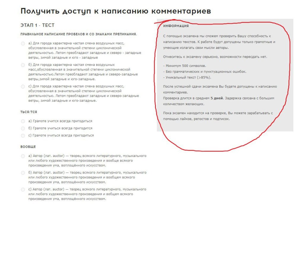 Отнеситесь к экзамену серьезно, возможности пересдать нет. После успешной сдачи экзамена Вы будете допущены к написанию комментариев. Проверка длится в среднем 3 дня (экзамен). Задержка связана с большим количеством желающих. Пока экзамен находится на проверке, Вы можете зарабатывать с помощью лайков, репостов и подписок. (лично я ни 1 сотню рублей на этом поднял, выполняется быстро и легко) Написать экзамен будет довольно просто, но я не советую в самом тексте менять рус. символы на анг. (я так не делал на экзамене, т.к. думаю, что их прога читает это). Идем другим путем — ищем похожие темы в интернете (или если вы умеете четко излагать свои мысли и уверены в них, как я — пишем случай из жизни) и изменяем их, чтобы получить от 86 до 100 % уникальности. (Уникальность текста можно проверить на text.ru она лучшая среди аналогов)